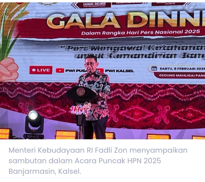 Menteri Kebudayaan RI Fadli Zon menyampaikan sambutan dalam Acara Puncak Hari Pers Nasional (HPN) 2025 di Banjarmasin, Kalsel. Pada Minggu (9/2/2025).